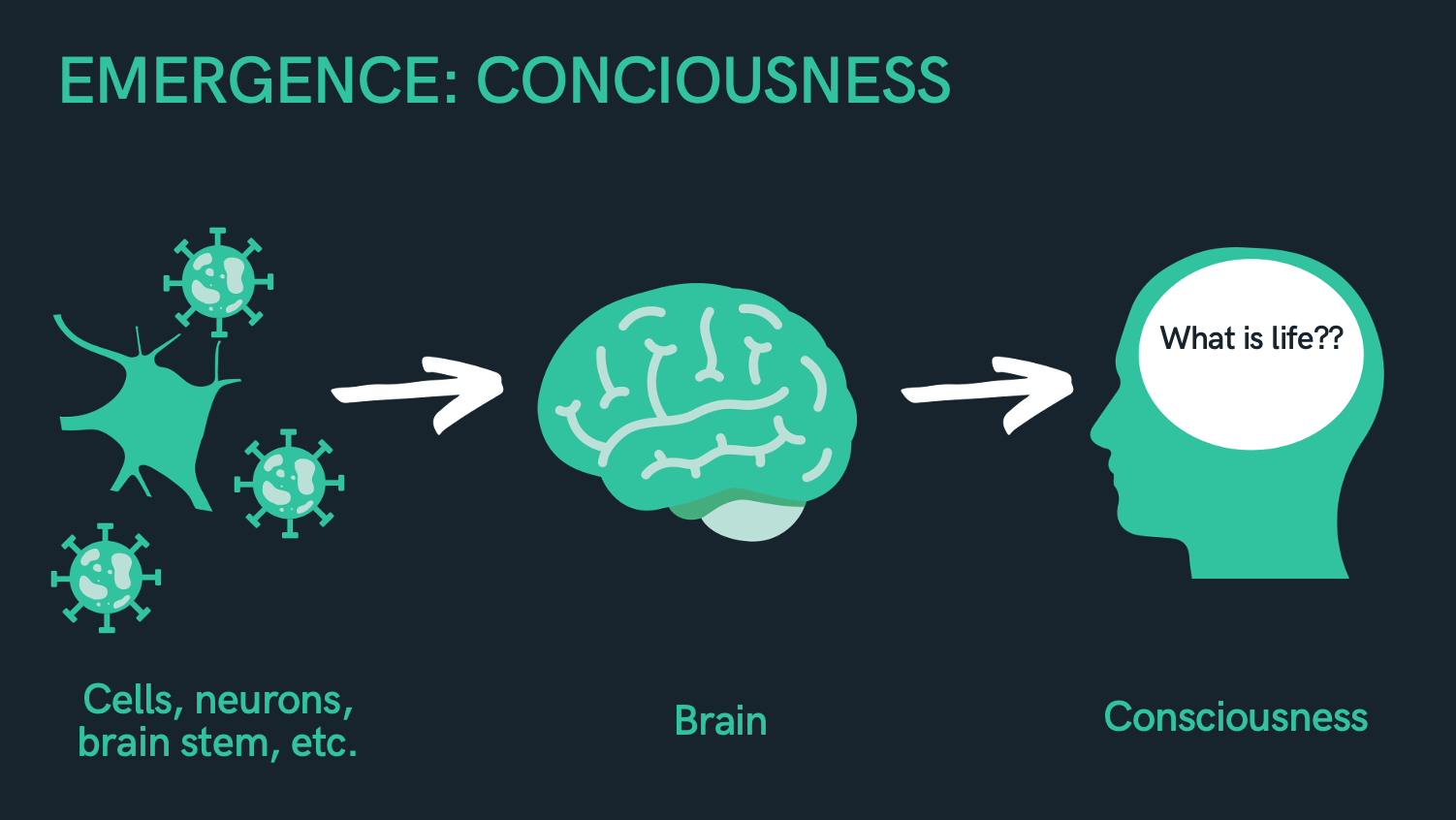 Human consciousness is another example. Consciousness is not simply the sum of the physical component parts of the brain: neurons, synapses, brain stem, etc. If you threw all those things together in a corner, you wouldn’t expect consciousness to arise. Consciousness only arises from the combinations and synergies of its component parts which form layers of new structures which re-combine to scaffold new combinations, and so on. These combinations of combinations ultimately emerge an entirely unexpected and non-mathematically calculable outcome: consciousness.