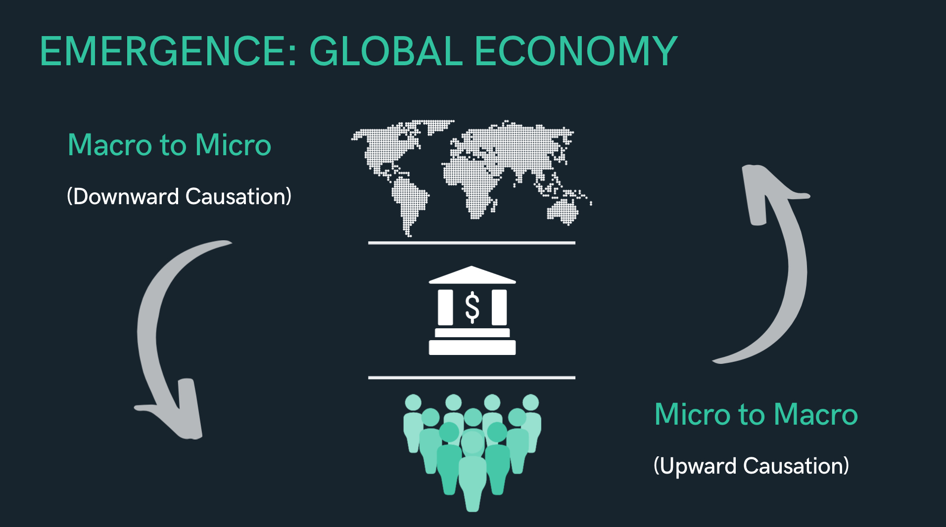 Democracy is another helpful example – we elect leaders, create laws and structures which govern our behaviour (we exert upward causation on the system), and those laws and structures govern our behavior (there is downward causation from the system to our actions). Similarly with the global economy — we create agreements about money and value, create institutions to exchange, govern, and facilitate the flow of that 'value,' and what emerges is a hyper-networked and complex global economy. That economy then influences our behavior.
