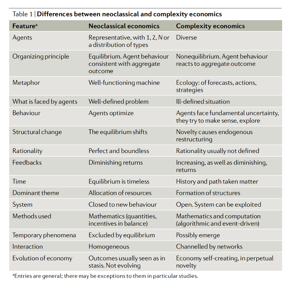 • Helpful table on neoclassical vs. complexity economics (for my fellow econ nerds out there) from W. Brian Arthur's paper I referenced above, Foundations of Complexity Economics:
