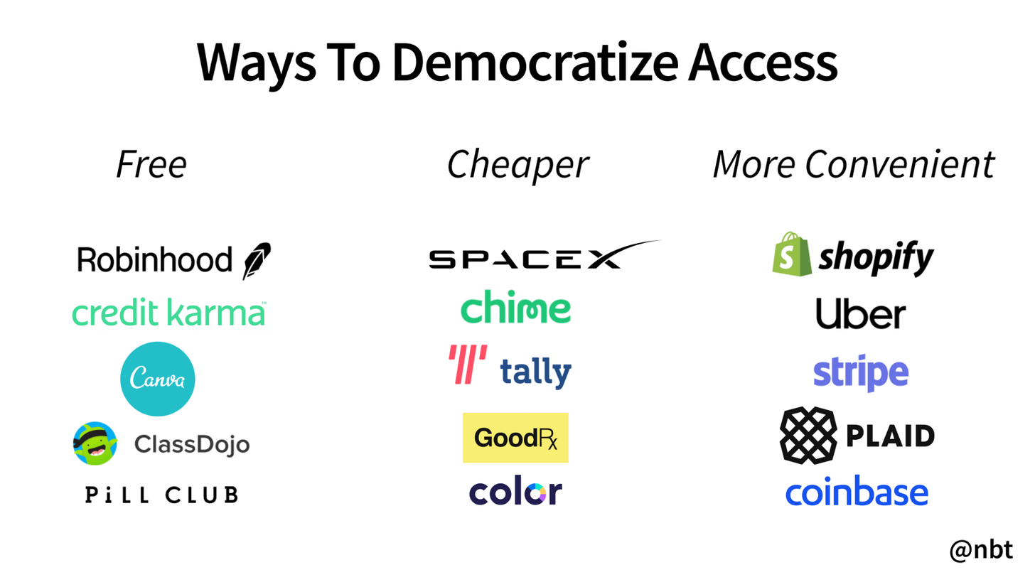 Democratizing access sounds great, and it often can be. According to Silicon Valley venture capitalist Nikhil Basu Trivedi, “There are three types of companies that democratize access to a product or service: