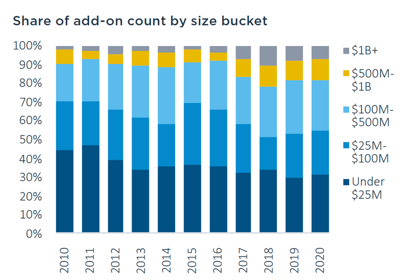 “Add-ons have steadily increased in importance as a PE strategy over the past two decades” according to Pitchbook. Many of these add-on acquisitions fall below the HSR reporting threshold, with the median buyout size now around $70 million. The chart below shows that over 50% of add-ons are below $100 million.