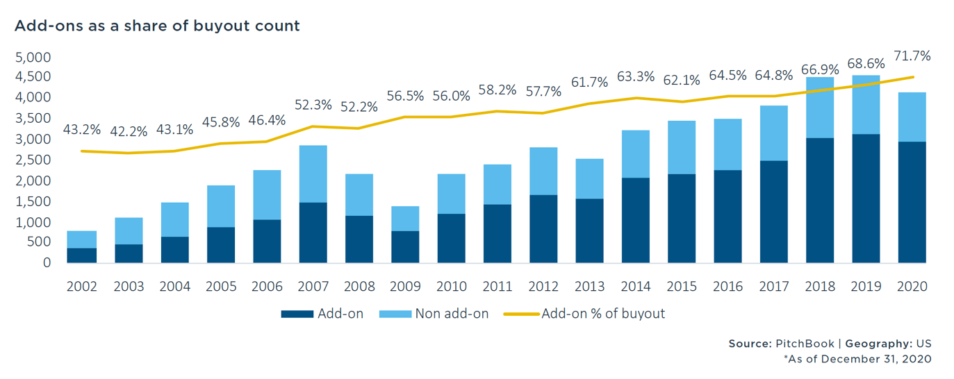 In 2020, 71.1% of PE deals in the US were add-ons, which are when a PE firm uses a company it already owns to do acquisitions, instead of investing in many smaller companies directly through separate investments. Add-on acquisitions help the private equity firm build a larger company that it can eventually re-sell at a higher price, often because of newly acquired market power. More than 70% of private equity transactions are add-ons. When a number of add-on acquisitions are made in one industry, it is referred to as a “roll-up” because they are meant to “roll-up” or consolidate an industry.
